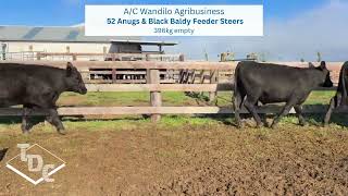 A/c Wandilo Agribusiness. 52 Angus and Black Baldy steers weighed 380-452kg full to avg 396kg empty at delivery. These steers were purchased Ex Mt Gambier and Naracoorte saleyards in the November store sales 2025 at an avg of 280kg. The steers were purchased to grow into feeder weight steers and eat the excess feed. With feed running out and the cattle being supplementary fed hay it is time to move them on. The hard work has been done and now these steers have the right weight and age to perform in a feedlot or to be grow into future bullocks. They are showing great weight for age and are continuing to put the weigh on. Please note steers were weighed 380-452kg with only 2 steers falling outside of that, one being 495kg and one 552kg.