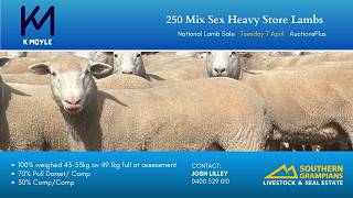 Vendor carefully selects the sires from chrome sheep studs with a big emphasis on all maternal traits, also keeps a strong focus on growth and positive fat a muscle which shows in these lambs. Terminal sires are selected from Elsted Poll Dorsets which are extreme in growth rates and positive figures.These lamb are in fresh forward condition and have plenty of weight to finish into heavy trade or export weight with high yielding potential. Lambs have a big bill of health and biosecurity is at a high standard. 70% Poll Dorset/Comp 30% Comp/Comp, Shorn, drenched and jetted.
