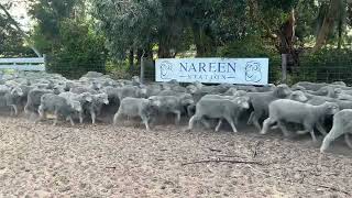 This is a draft of Nareen Station bred merino wether lambs, located at Boyong, Mt Benson SA. These lambs are part of the Nareen Station Annual Production Sale. Nareen Station aims to breed sheep that are highly profitable and easy care. The breeding objectives in the commercial flock are to have adult sheep which are 18-19 micron and capable of cutting large quantities of white, bright wool on a plain bodied sheep.